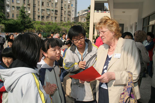4月17日,代表团来到南京五十中访问,校党委书记朱全明在校门口迎候外宾。正值学校的早操时间,操场上学生们整齐的队伍,朝气蓬勃的精神,引得英国客人们驻足观看,不断地为同学们鼓掌喝彩。五十中在南京市鼓楼区以丰富的教学形式和内容,充分活跃学生的思维和创造力见长,此时,学校有十个班级正在教授卡通、扑克牌中的数学、魔方、集邮、书法、音乐欣赏、剪纸、彩绘和陶瓷艺术等课程,英国客人们根据自己的喜好分别进入班级,与学生们一起听课,一起学习,一起参与动手,分享学习心得。他们说,向同学们学会的剪纸,将带回英国留作纪念;数学课上,老师学生们邀请外国客人一起玩数学游戏,引起了阵阵笑声和掌声;在“歌声中的英语”课堂,杨勇老师采用先进的多媒体技术播放了六首风格迥异的音乐,音乐声中,有的外国朋友陶醉地闭起了眼睛,有的跟着音乐扭动身体,还有的跟着节奏随声哼唱,快乐的气氛感染了在场的每一个人。在活动即将结束之时,团长卡罗尔女士代表所有团员走上讲台,称赞同学们的创造力和学习能力,她说,中国中学的教学方式和课程,非常新颖有趣,我们都非常喜欢与学生们一起共同渡过快乐时光。全体访华团成员与学校师生代表们合影留念后,依依不舍的离开了校园。