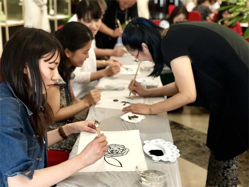 除此之外,日本学生们还亲自动手,体验折扇绘画和瓦当拓印等中国传统技艺。在爱涛艺术中心,古歌博物馆发起人、收藏家、画家高欢老师和国家一级美术师、江苏省国画院副院长喻慧夫妇亲自为学生们示范,并手把手教导,教学生们画山、画水、画竹、画石,从线条勾勒到晕色渲染,展示了中国传统工笔画的巨大魅力。